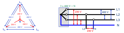 Les tensions maximums seront alors de 400 V entre chaque ligne et de 230 V entre chaque ligne et le neutre. Voir illustration ci-dessous :