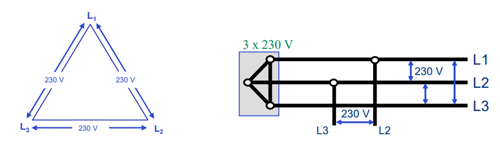 La tension maximum possible n’est donc que de 230 V entre chaque ligne comme vous pouvez le voir sur l’illustration ci-dessous.